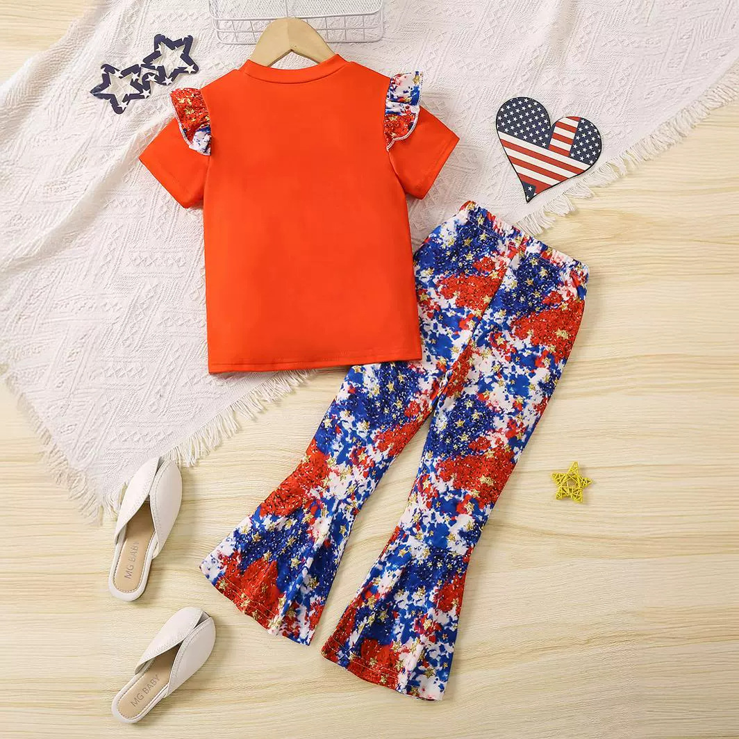 3-8 T Kid Girl Bow Independence Day Printed Short Sleeved Flared 2 Pcs Set