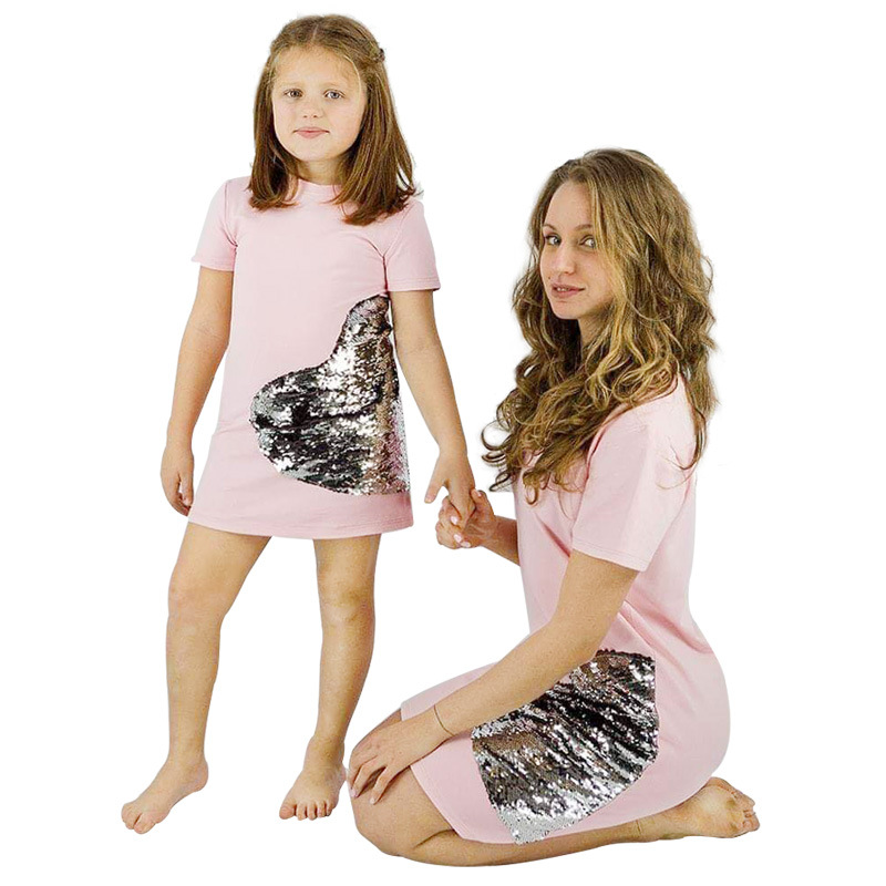 Family Matching Parent-child Pink Heart Sequins Pure Dresses