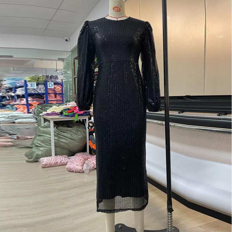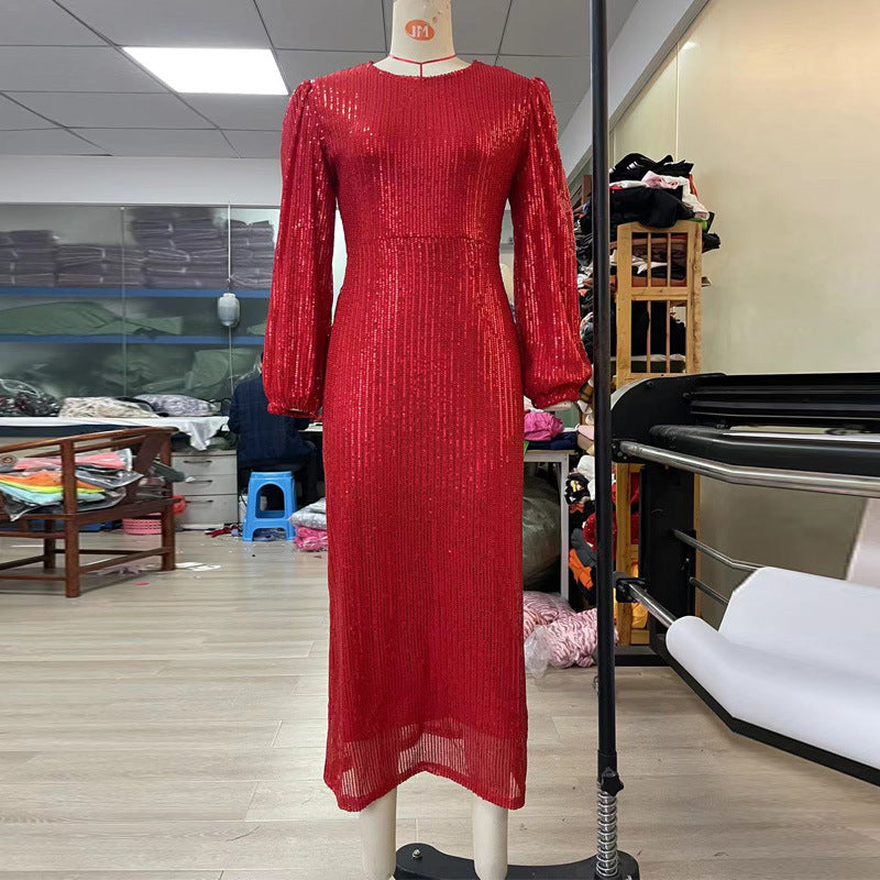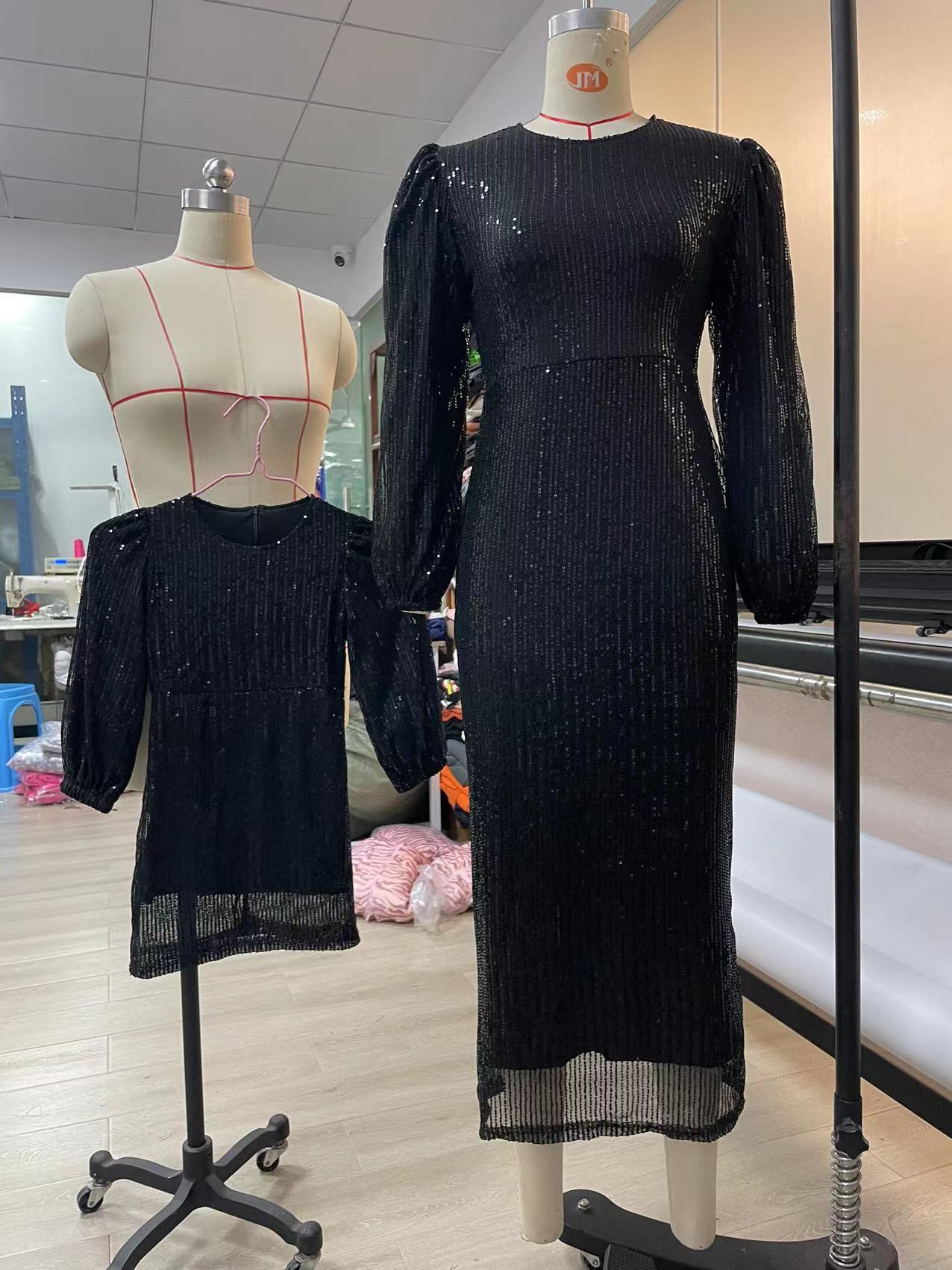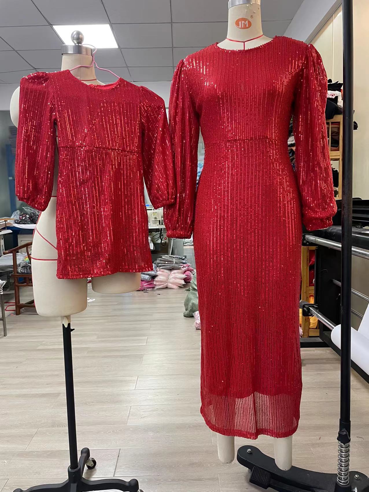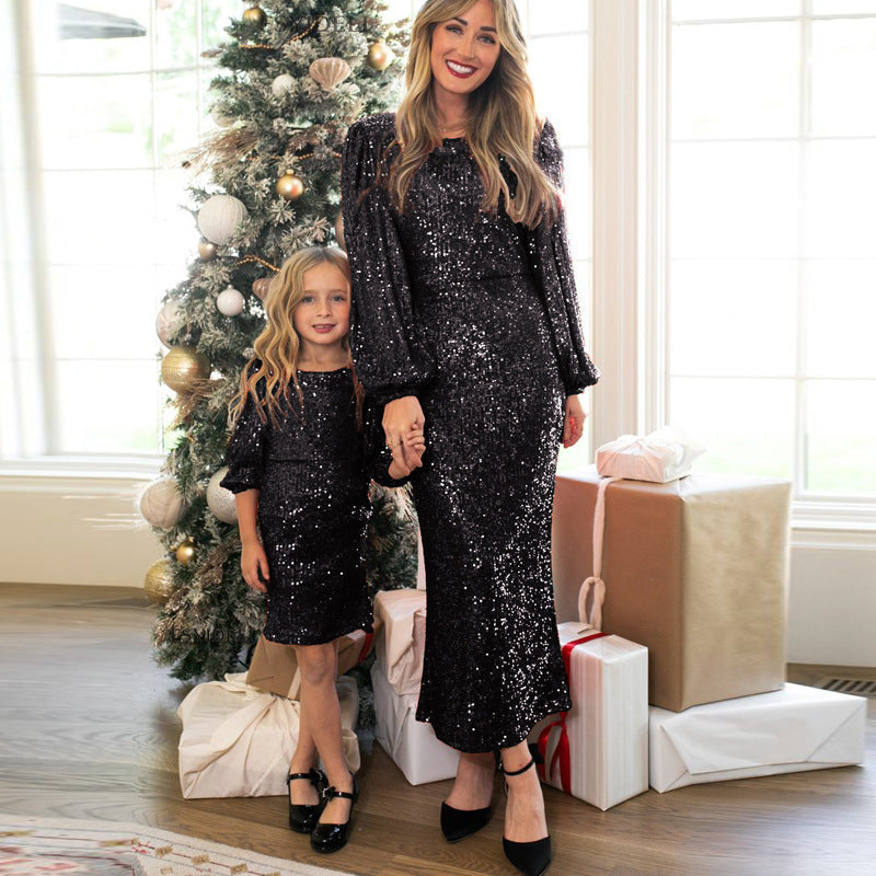 Family Matching Parent-child Long Sleeve Christmas Beaded Glistening Dresses