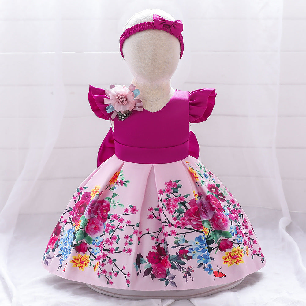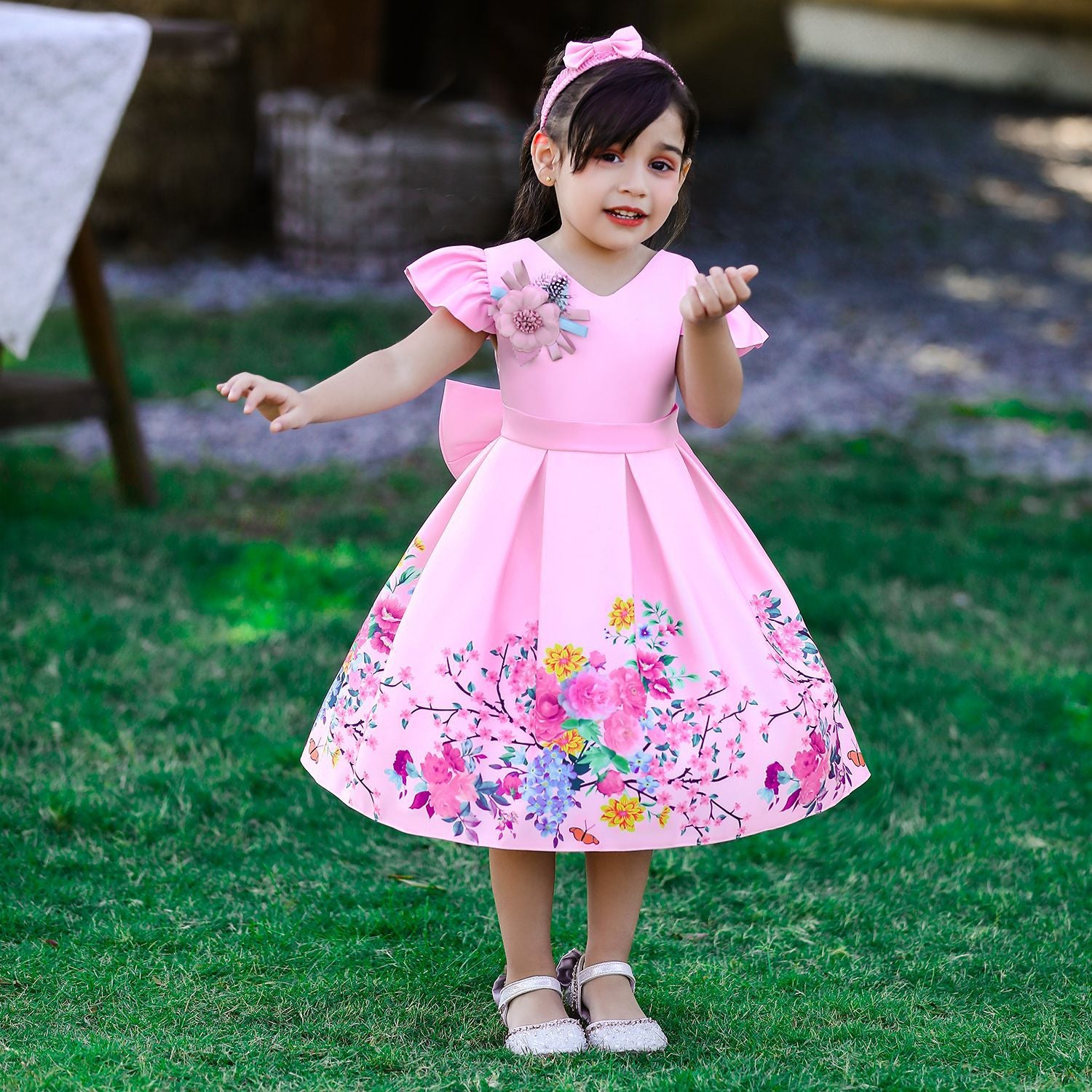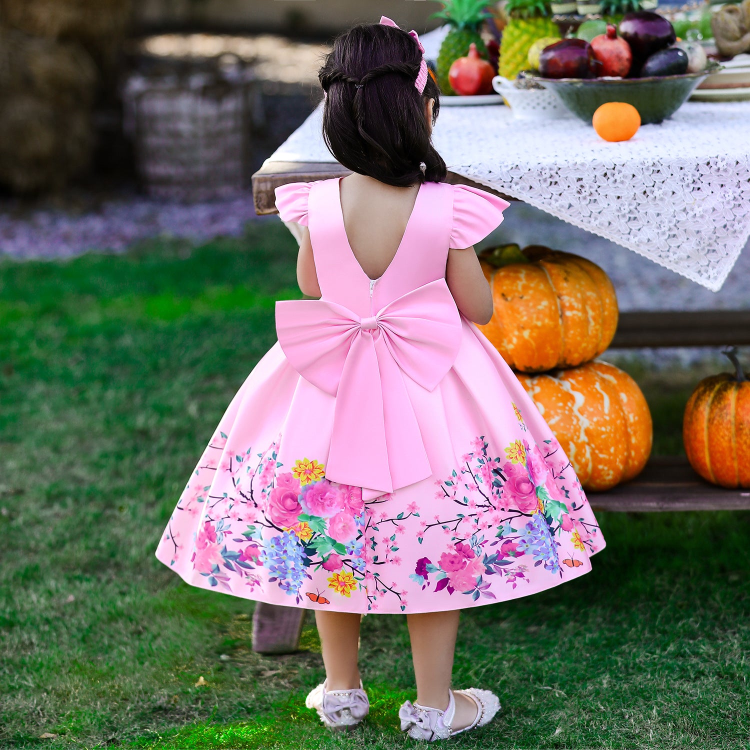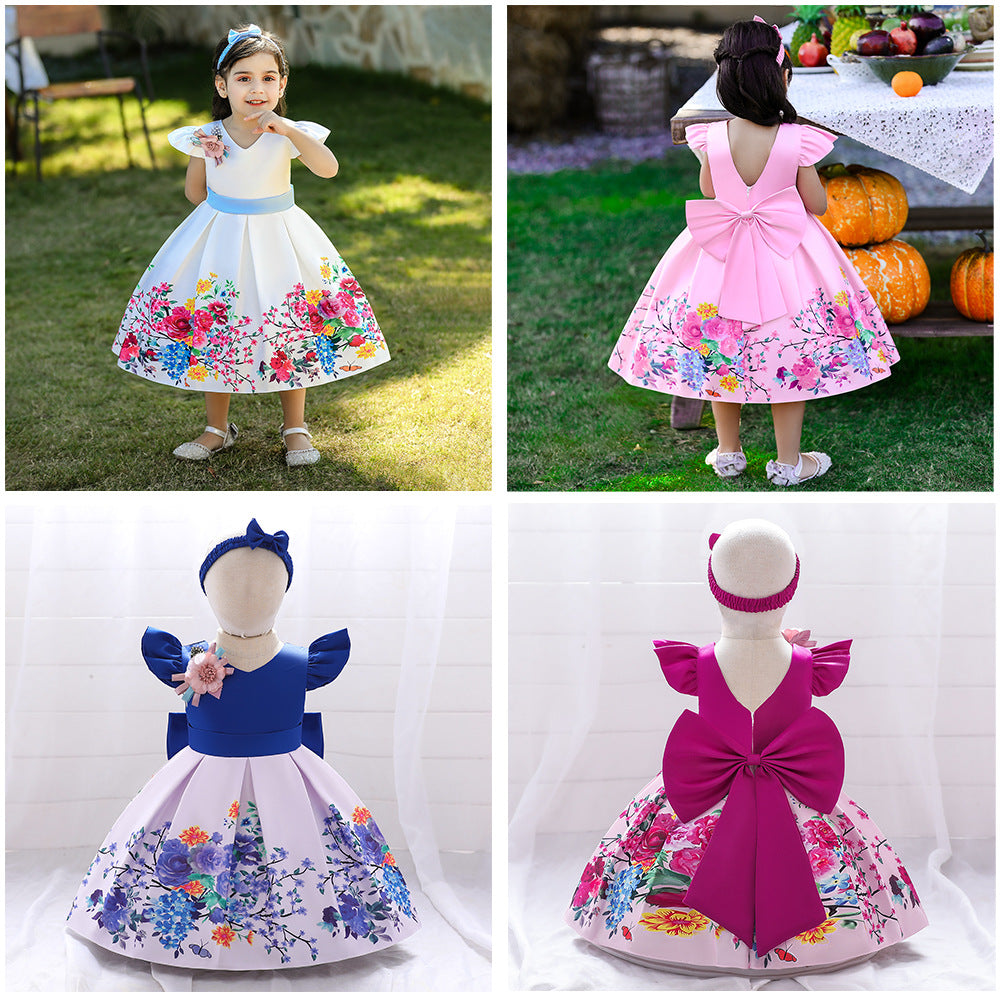 Kid Baby Girl Princess Bow-tie Printed Pleated Patchwork Dresses