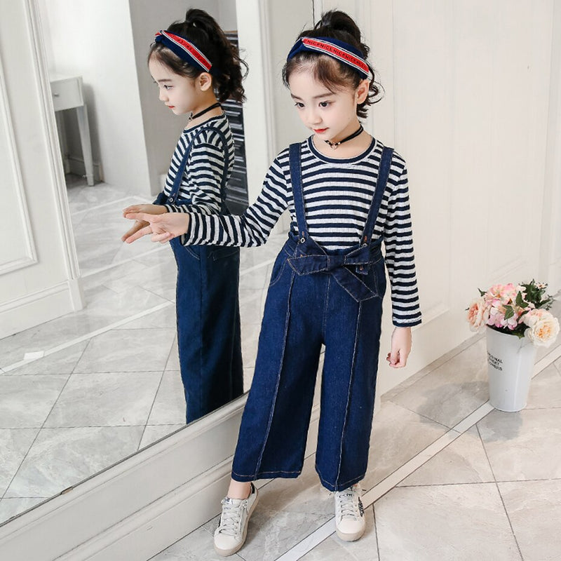 Girls Denim Bib Pants +Plaid Tops 2 Pcs Suits 3-16 Years
