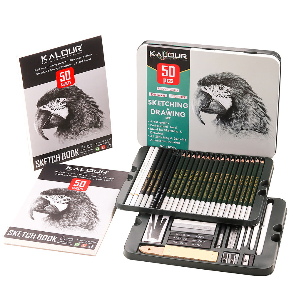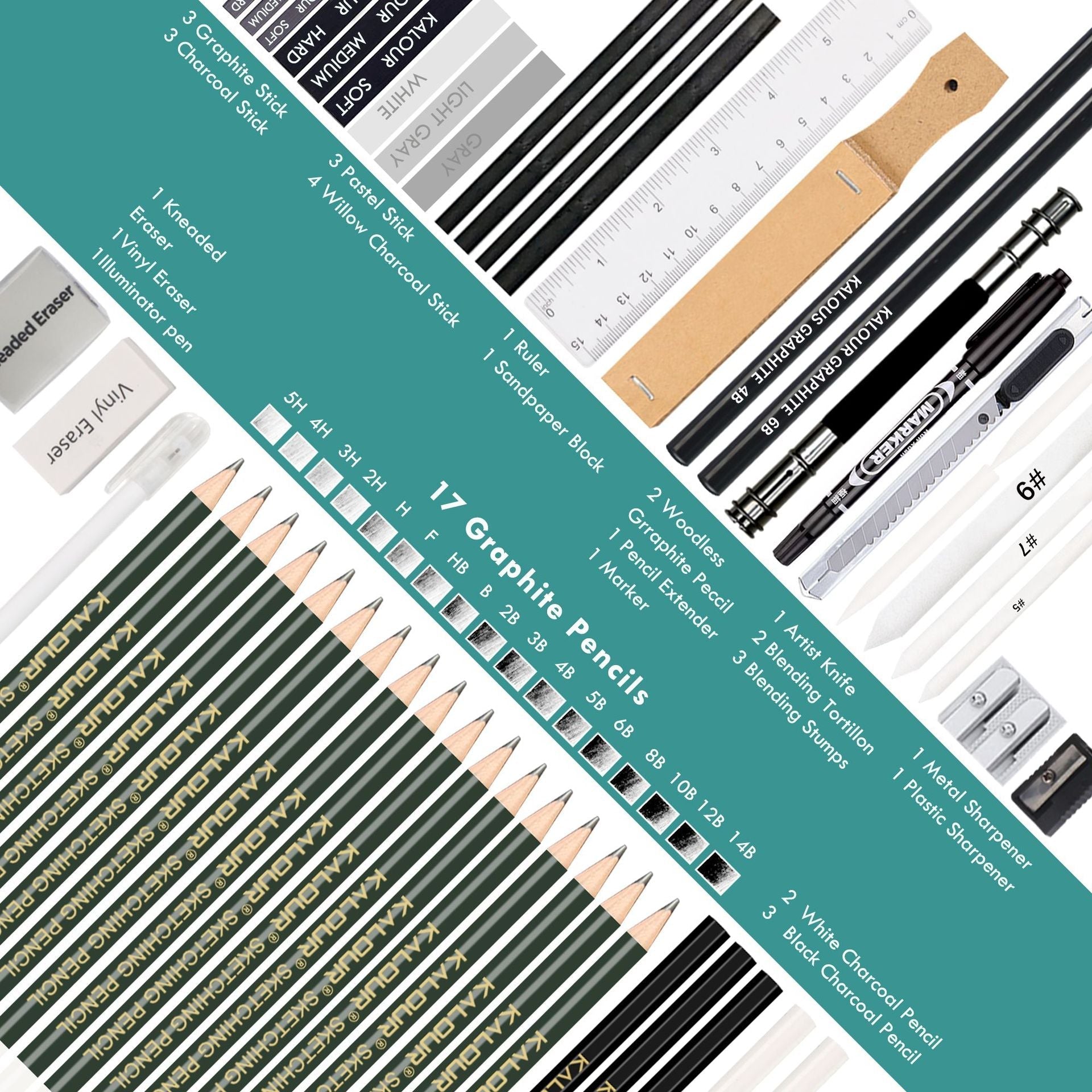 17 sketching pencils (14B 12B 10B 8B 6B 5B 4B 3B 2B B HB F H 2H 3H 4H 5H ), 4 wicker sticks, 3 carbon sticks, 3 graphite sticks,3 light-colored carbon sticks, 3 carbon pens (soft/medium/hard), 3 solid paper pens (5#7#9#), 2 hollow paper pens, 2 white carbon pens, 2*50 pages A5 Sketchbook,1 Graphite 4B, 1 Graphite 6B, 1 sandpaper board, white eraser, soft eraser, 1 utility knife, 1 pencil extender, 1 single-hole plastic pencil sharpener,1 plastic double hole metal pencil sharpener
